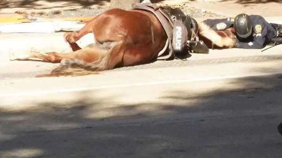 A Houston, TX, police officer lay down next to his fallen mount on Thursday after the horse spooked, ran into the street, and was hit by a truck. Charlotte's human partner stayed with her as she died.