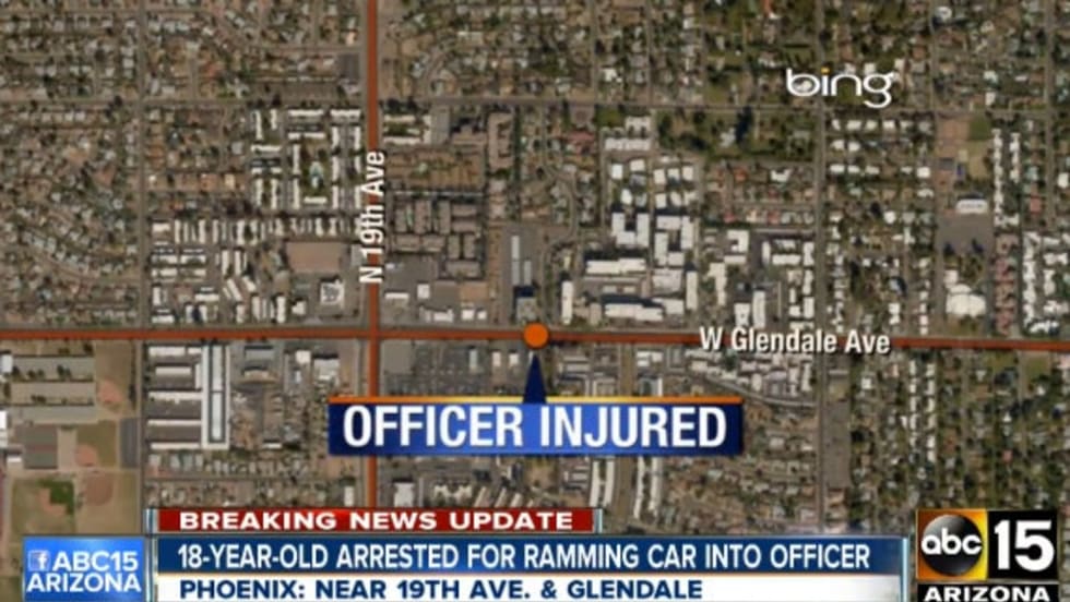 A Phoenix police officer is in the hospital after injuring his knee when a suspect drove toward him during a foot pursuit on Saturday morning.