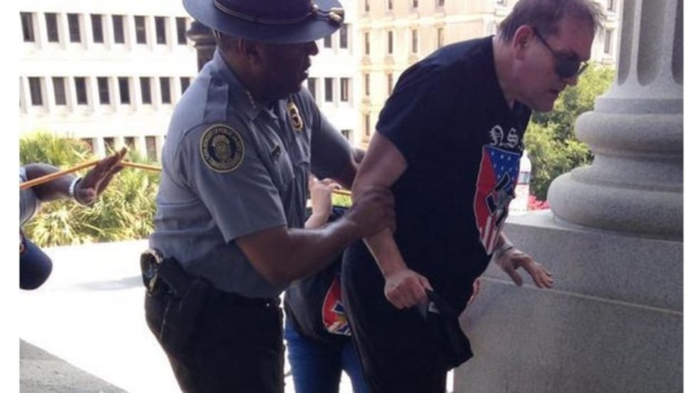 It was the powerful image of a black police officer assisting a man wearing a black T-shirt bearing a swastika and struggling in the heat that resonated online.