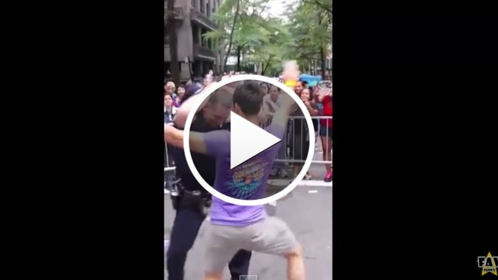 A 12-second clip shows what appears to be an NYPD officer backing it up and shaking what his mama gave him with a man who was marching in the parade.