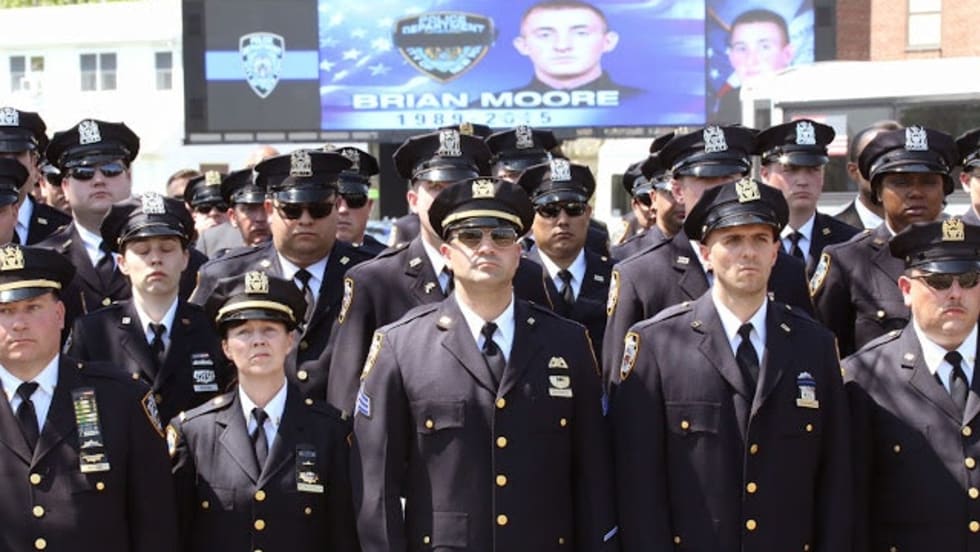 Before the procession, a solemn quiet was only broken by the sound of bagpipes as Moore's hearse was driven to the overflowing St. James Roman Catholic Church. A sea of officers in dress uniforms from as far as California, Louisiana and Canada lined the street in salute.