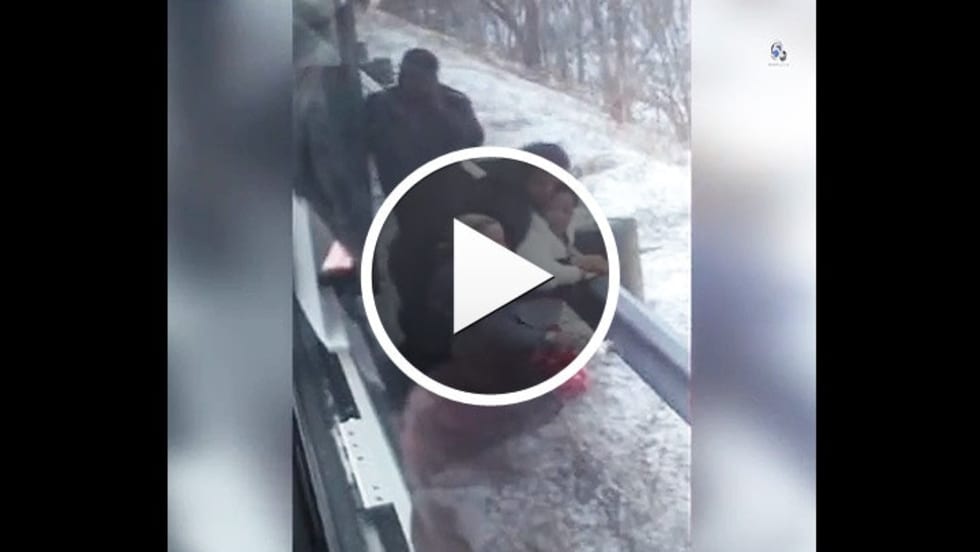 The video, shot from inside the bus, shows Taylor pinning Trooper Winans near a guardrail and punching her and pulling her hair. Passengers inside call on others to help.