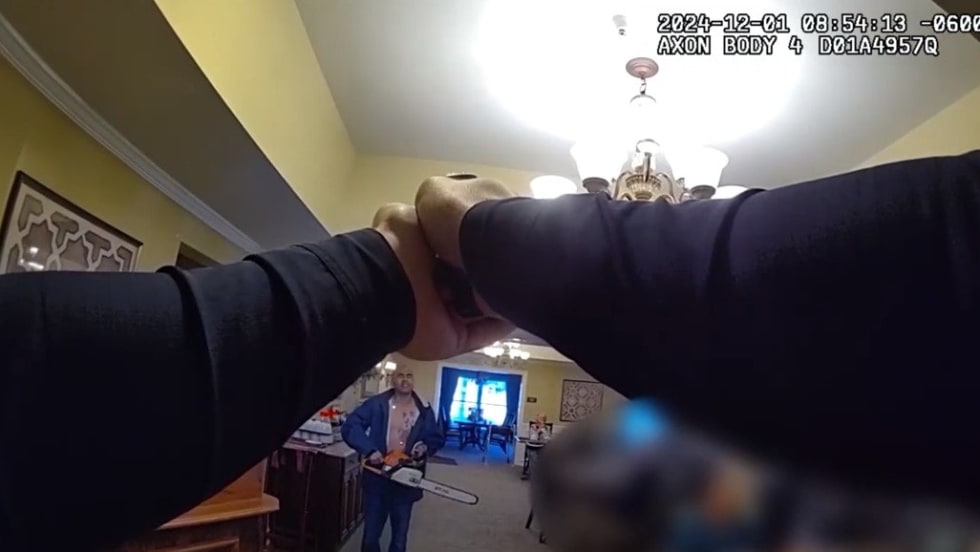 The suspect ignored the order...and fired up the chainsaw. The officer deployed his TASER, knocking down the suspect. But before he could be taken into custody, he got back up, grabbed the running chainsaw, and ran toward the officer.