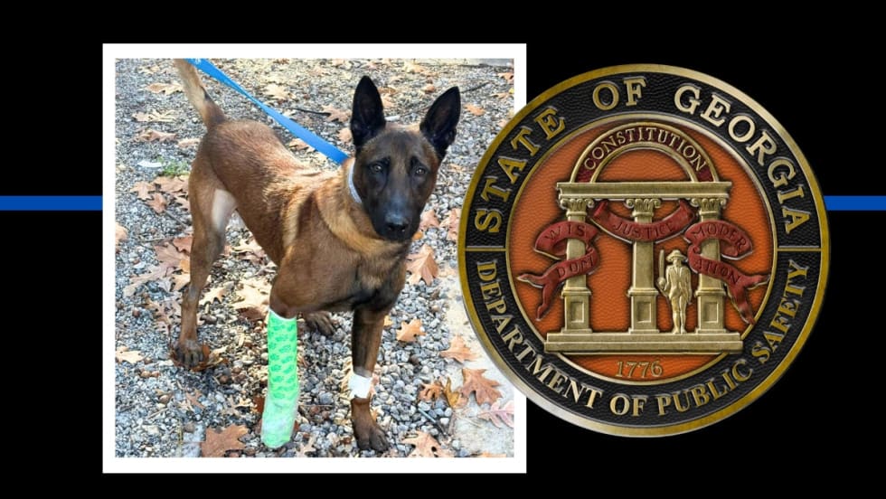 A Georgia State Patrol K-9 was wounded during a car chase when the suspect fired shots into the trooper’s patrol vehicle. K-9 Armor was sent home Friday to recover, a process expected to take two to four months.