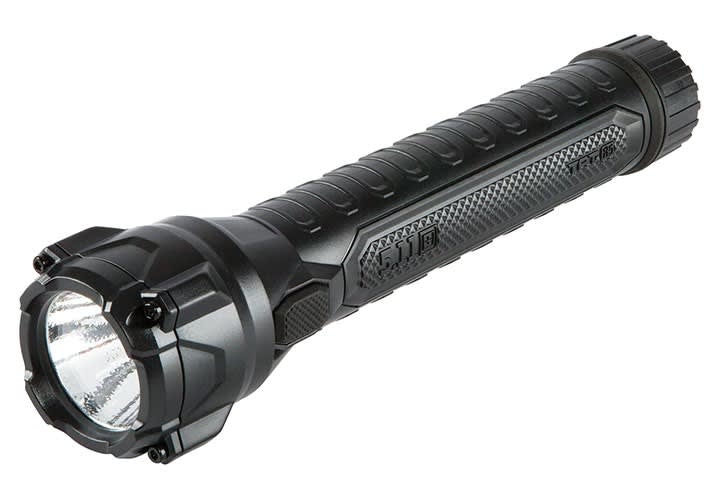 5.11 Tactical's TPT R5 14 Flashlight is a lightweight full-sized rechargeable duty light that features a squared head to prevent rolling, a smart switch to silently toggle between high, low, or strobe modes, and a Cree XM-GB LED light source.