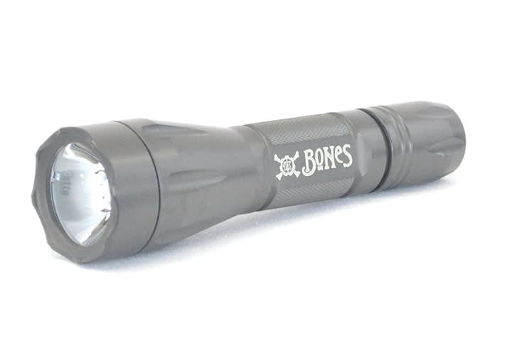 This light is finished in natural gray Type III hard anodizing and projects light through a field-replaceable solid-acrylic optical lens—there is no reflector. The Bones Flashlight is made in the USA.