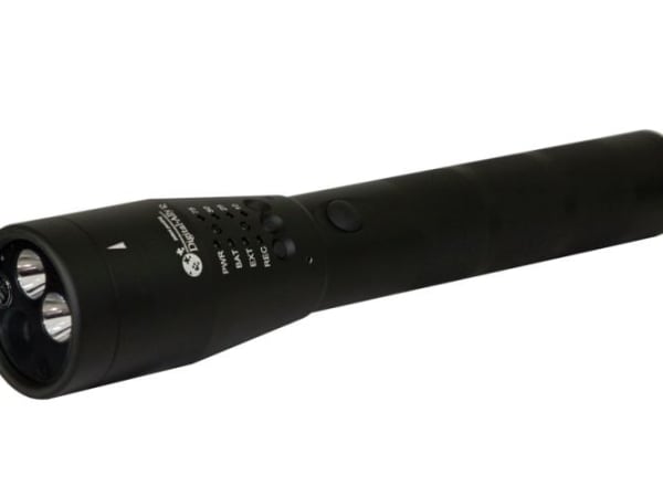 The DVF-500 from Digital Ally has a complete digital video system integrated into a water- and shock-resistant, machined aluminum flashlight. This tough flashlight features unbreakable LED lights and records onto solid state memory, which is not affected by temperature, vibration, or impacts and will retain your data even if the battery goes dead. Audio/video may be recorded with or without the lights active. The wide-angle lens allows recording without careful aiming and pre-event recording allows up to 60 seconds before pressing the record button to also be recorded. The rechargeable LiIon battery pack lasts up to 16 hours and the memory will hold up to eight hours of footage.