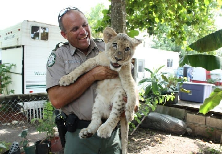 Officer Erik Steinmneetz holds a lion cub in "Operation Wild," Episode 102: Pythons, Gators and Grizzlys Oh My!