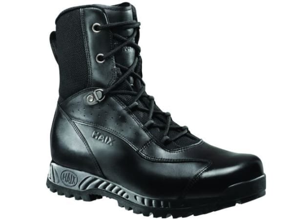 The Haix GSG9-S 8-inch tactical boot features a lightweight, slim design with abrasion-resistant fabric and minimal seaming on the inside leg for fast roping. Developed in cooperation with police and SWAT teams, the flame-resistant boot is constructed with Sun Reflect leather that reduces the heating effect of direct sunlight while also providing water resistance and breathability. The boot also features the Haix Secura Liner, which offers additional protection from chemicals and bodily fluids.