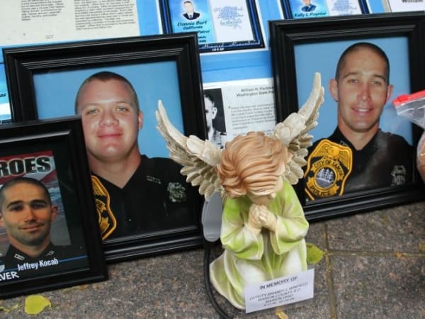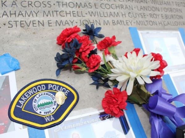 The four Lakewood (Wash.) Police officers were remembered with the agency's more traditional patch than a year ago, when special grey patches were added with black stars representing each slain officer.