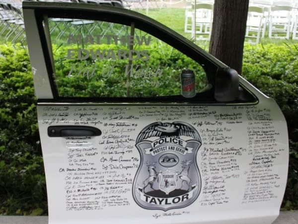 The brother of Tayor (Mich.) Police Officer Matthew Edwards brought the officer's cruiser door signed by other members of the agency. It also includes the message, "Cover your target!"