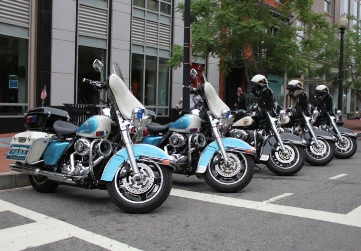 Motor officers rode in unison to the memorial prior to the vigil, and parked their motorcycles. Photo: Paul Clinton.