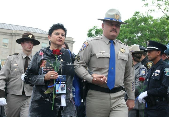 Prior to Friday's candlelight vigil, officers escorted police survivors to their seats at the law enforcement memorial. Photo: NLEOMF.