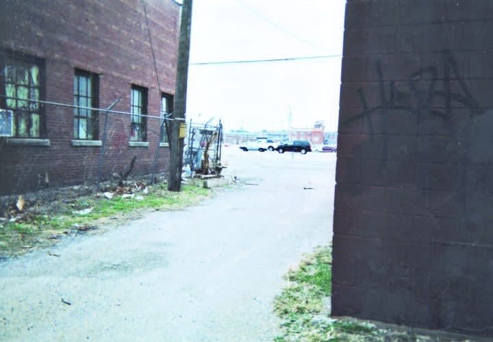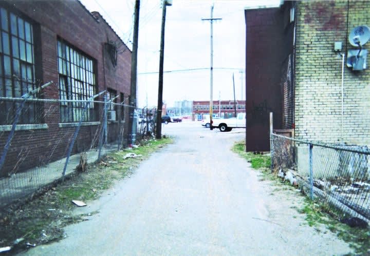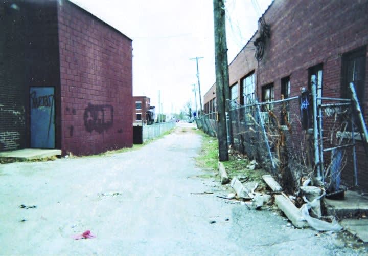 This is a view looking north up the alley where the firefight took place. Steven Williams, a 21-year-old robbery suspect, was positioned next to the metal plate on the right between the fence and the building.