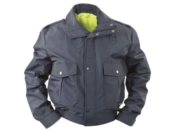 Innovative details of Elbeco's Bomber-styled Lifesaver jacket include front patch pockets with hand-warmer side-entry points and side-entry hand-warmers on the Hi-Vis side, functional mic clips, and side zipper vents for easy equipment access. Standard badge tab eyelets are attached to both the dark and Hi-Vis sides. Colors available include dark navy and black.