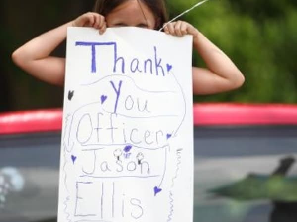 A local resident thanks Officer Ellis for his service.
