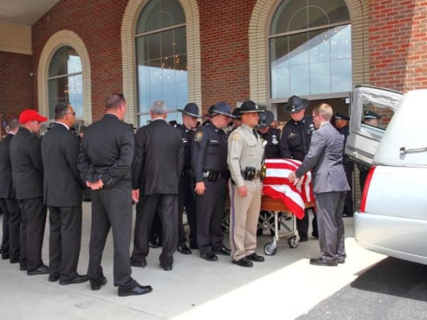 Officers prepare to load Officer Ellis into the hearse.