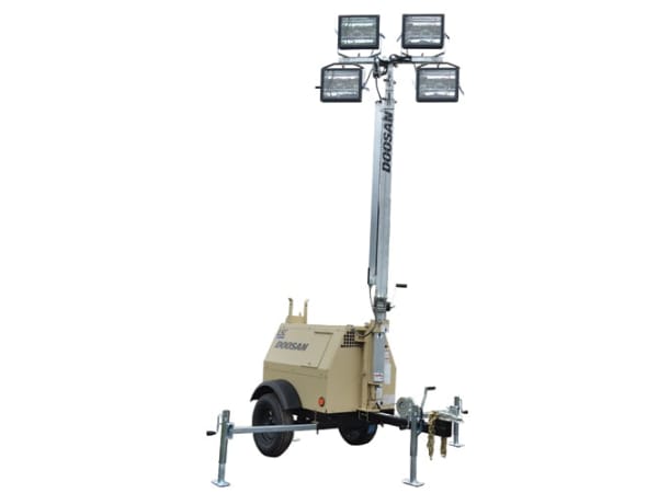 The Doosan LSC portable light tower features a Kubota D1005 Tier 4 final engine. The power rating is 6 kW with the utilization of a high-output alternator. This additional voltage allows operators to illuminate the unit’s four 1,000-watt metal halide floodlights and utilize the receptacle power function simultaneously. Fuel tank capacity extends runtime to 55 hours. The floodlights of the LSC provide a NEMA 6 x 7 beam spread for broad light distribution and area coverage. The heavy-duty galvanized steel mast extends from 12 to 30 feet and is raised by dual, hand-operated winches and features an automatic safety brake.