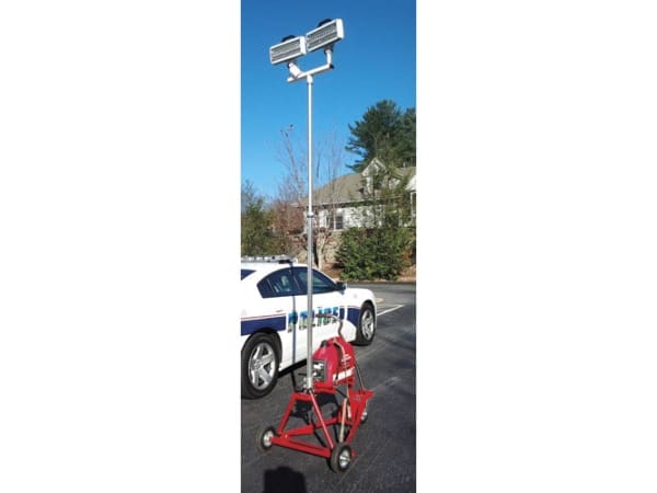 Traffic Safety System's All Terrain Scene Light Cart Generator LED scene light provides single unit lighting and mobility for large scenes. The Honda EU1000i has a runtime of 6 to 8 hours and is secured to a steel, power coated frame. Two Spectra LED lightheads attached to a removable extension pole give off 20,000 lumens each and only take 250 watts of power to operate. The lightheads can face in the same or opposite directions. One person can carry, set up, and operate the ATSL and now it has a mobile option to move it long distances easily.
