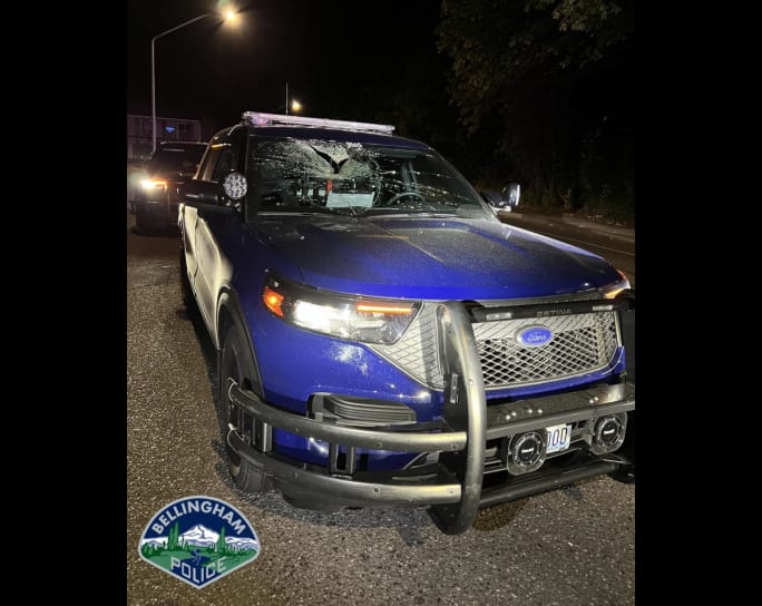 “Imagine driving along in the early morning hours and suddenly your windshield explodes in front of you and glass sprays everywhere. That is what two of our officers faced early Saturday morning,” states the Bellingham Police Department in a social media post. “We are so grateful our officers were not seriously injured during the reckless and dangerous actions of the suspect.”