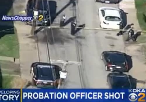 Police say a bullet penetrated the skull of the Allegheny County, PA, probation officer, and his client was shot five times. Police are looking for two suspects.
