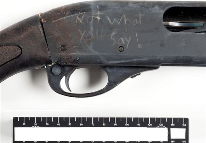 "Purple duct tape covered the end of the stock and handwritten etchings were present on various parts of the shotgun," according to the FBI release. "Etched into the barrel of the shotgun were the words 'End to the torment!' Etched into the right side of the shotgun receiver were the words 'Not what yall say!' and etched into the left side of the receiver were the phrases 'Better off this way!' and 'My ELF weapon!'"