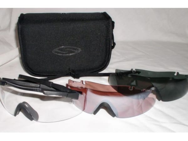 Smith Optics' Aegis Eye Shields come in what the company calls a Field Kit. It includes the frame, three sets of lens, a neck retention leash, a cloth storage bag, and a cleaning cloth. The lenses are easy to change, using a built-in rotating hinge system. The glasses meet Mil-Spec standards, have distortion-free and anti-fog lenses, and offer 100 percent UV protection. An Rx adaptor is available. Available from numerous merchants for about $80.