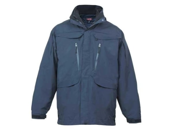 Like a lot of the latest law enforcement outerwear, TRU-Spec's Weathershield Jacket is a 3-in-1 design. This jacket is weatherproof, waterproof, and offers breathable protection against the elements. Tri-layer construction guarantees warmth and dryness in all conditions. Features include smooth operating zippers; mic loops; roomy, well-designed pockets; detachable ID tags; back yoke with detachable ID panel; and ample room for carrying a holstered firearm. Available from numerous merchants for around $160.