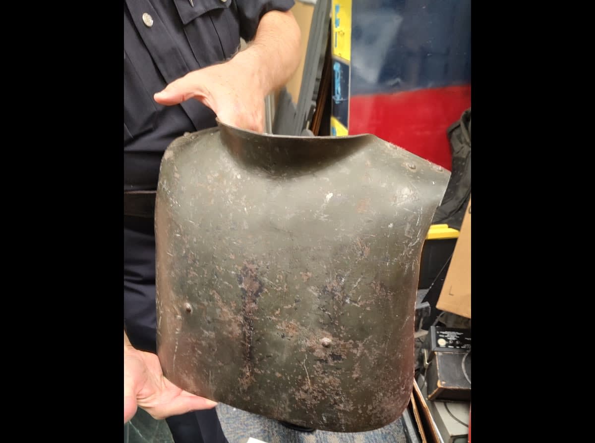 The collection includes early body armor worn by an officer in the late 1800s or early 1900s.