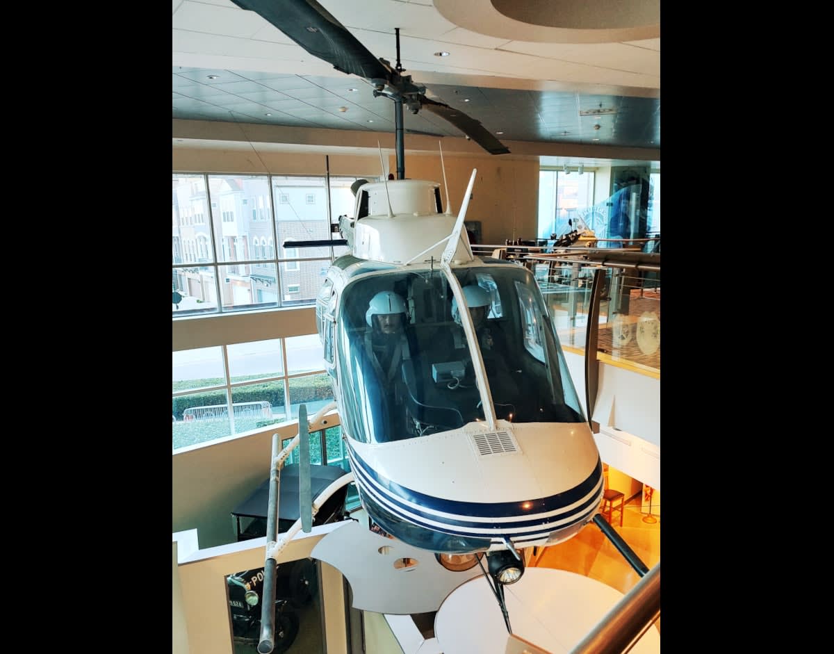 A suspended Bell helicopter near the entrance honors three officers killed in crashes.