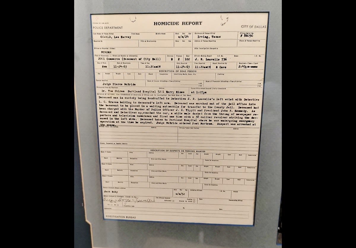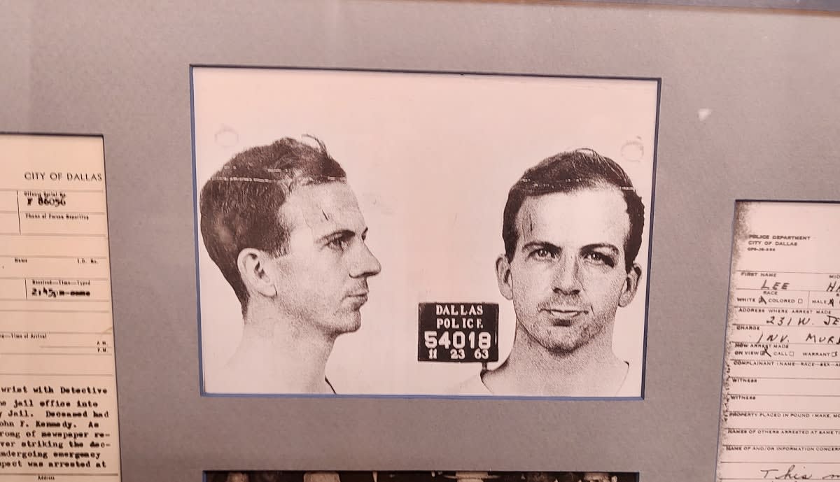 Arrest photos of Lee Harvey Oswald are framed along with related documents.