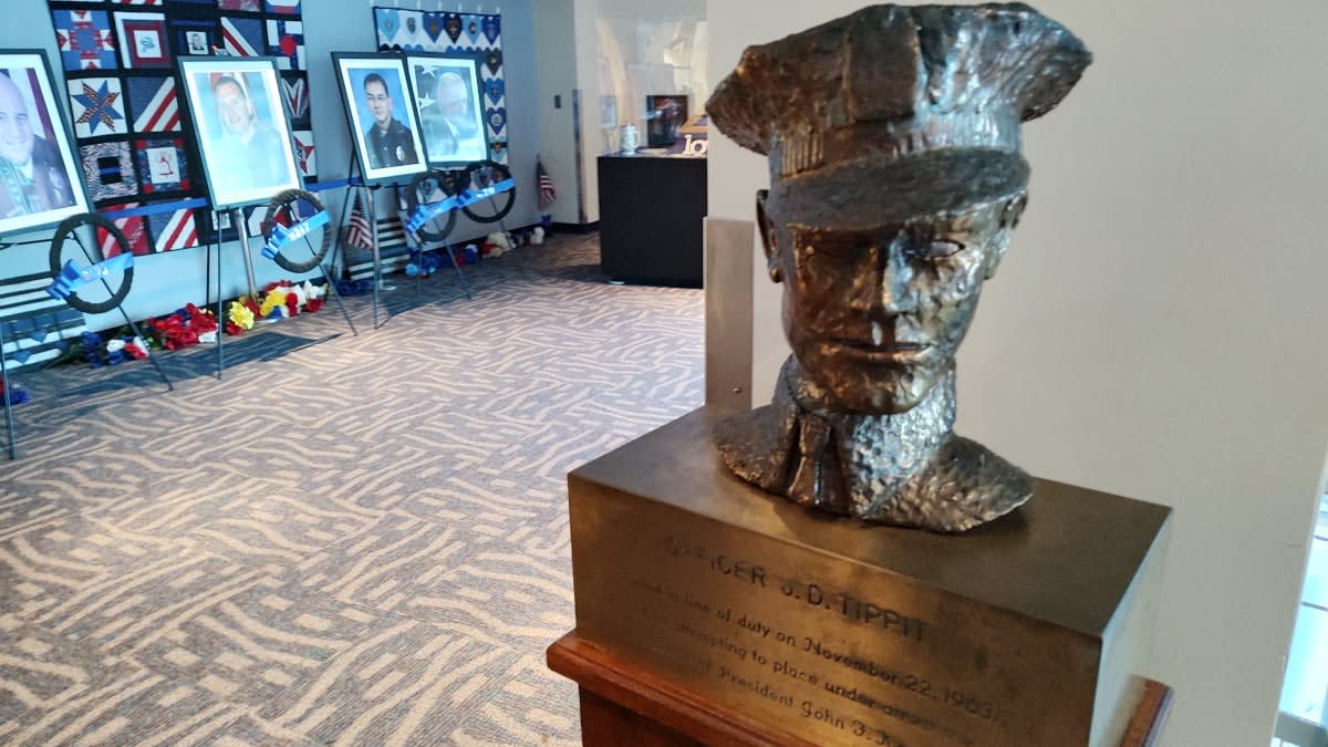 A sculpture of Officer J.D. Tippit memorializes his sacrifice after he was killed by Lee Harvey Oswald following the Kennedy assassination.