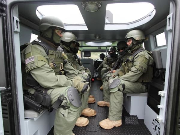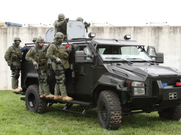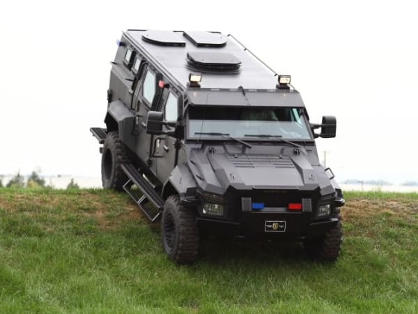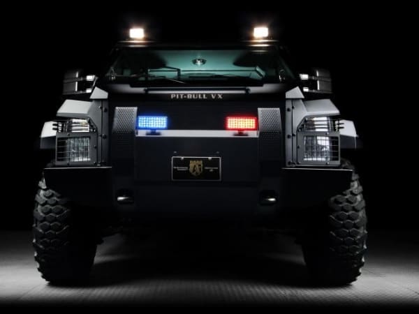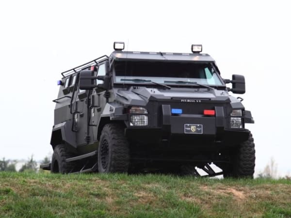 The Pit-bull VX from Alpine Armoring strikes an imposing stance, and may help violators rethink their barricaded position.