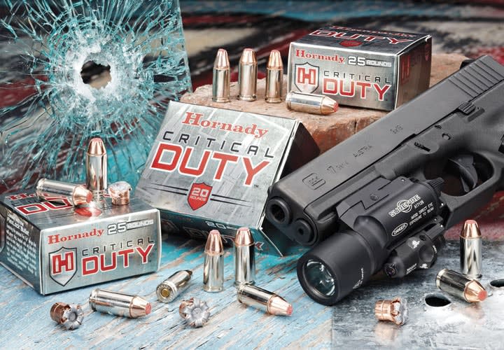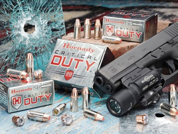 Hornady's Critical Duty handgun ammunition delivers consistent and reliable urban barrier performance. The Flex Tip design of the new FlexLock bullet eliminates clogging and aids bullet expansion. Its large mechanical jacket-to-core InterLock band works to keep the bullet and core from separating for maximum weight retention and proven terminal performance. It is available in 9mm 135-grain FlexLock, 9mm Luger +P 135-grain FlexLock, and .40 S&W 175-grain FlexLock.