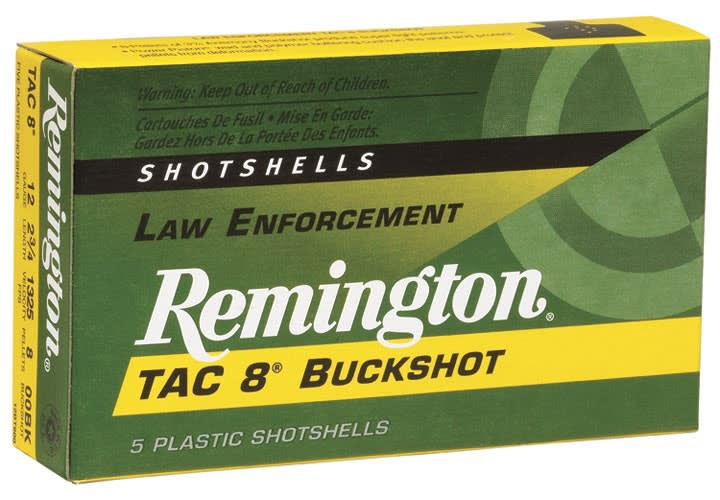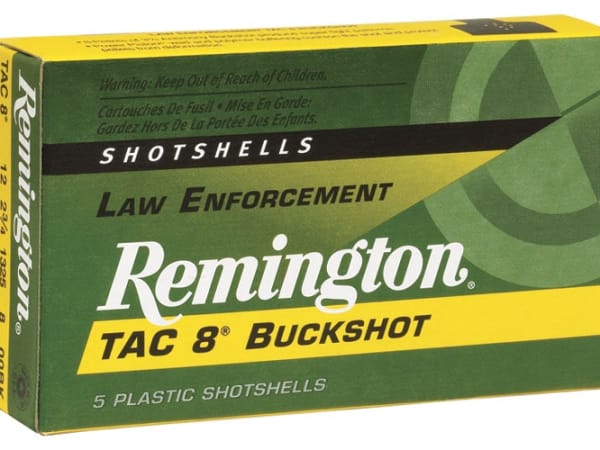 Remington's Tac 8 Buckshot is available in standard and Magnum loadings, and features Remington’s proprietary one-piece compression section Power Piston wad column, polymer buffering, and hardened 3% antimony pellets. The combination of these advanced features produce patterns 25% tighter than standard buckshot. In addition, Tac 8 is primer and mouth waterproofed for maximum reliability and weather integrity.