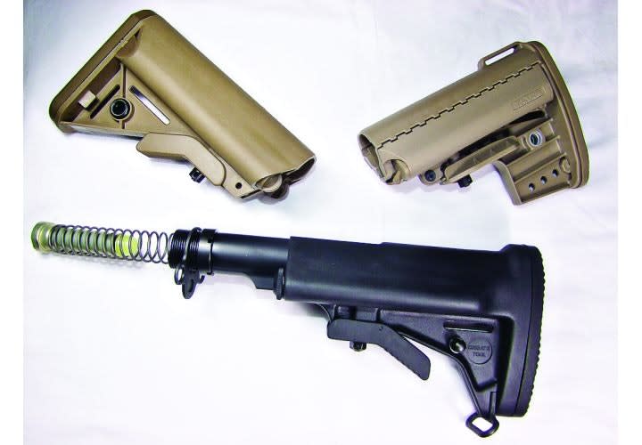 Some AR stocks from (clockwise from left) LMT, Vltor, and Choate have room for storage.