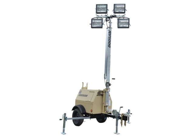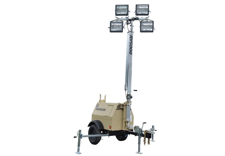 The Doosan LSC portable light tower features a Kubota D1005 Tier 4 final engine. The power rating is 6 kW with the utilization of a high-output alternator. This additional voltage allows operators to illuminate the unit’s four 1,000-watt metal halide floodlights and utilize the receptacle power function simultaneously. Fuel tank capacity extends runtime to 55 hours. The floodlights of the LSC provide a NEMA 6 x 7 beam spread for broad light distribution and area coverage. The heavy-duty galvanized steel mast extends from 12 to 30 feet and is raised by dual, hand-operated winches and features an automatic safety brake.