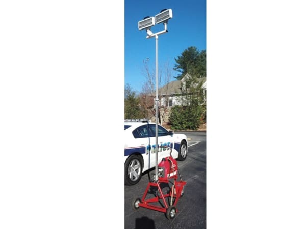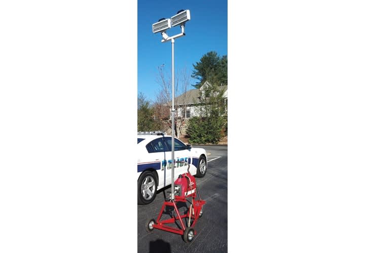 Traffic Safety System's All Terrain Scene Light Cart Generator LED scene light provides single unit lighting and mobility for large scenes. The Honda EU1000i has a runtime of 6 to 8 hours and is secured to a steel, power coated frame. Two Spectra LED lightheads attached to a removable extension pole give off 20,000 lumens each and only take 250 watts of power to operate. The lightheads can face in the same or opposite directions. One person can carry, set up, and operate the ATSL and now it has a mobile option to move it long distances easily.