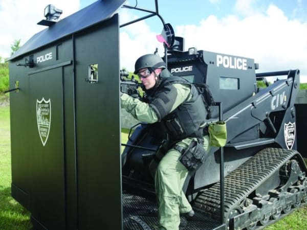 The Spiller Group's Rook is a multi-purpose tracked, armored vehicle that resembles a miniature bulldozer. Operators can deploy on the front and rear of the Rook shielded by armor that can stop rifle rounds. Its most interesting feature is an armored deployment and rescue platform, with hydraulic lift. The platform can be raised to a second-floor window, and is shielded by armor that has gunports. There's a sliding door in the armored shield, so officers can deploy forward through the shield. Other features on the Rook include a breaching, penetrating arm with a camera, a vehicle extraction attachment, a grapple bucket for removal of barriers and obstacles, and a tactical video recording system. The Rook is operated by a joy stick.