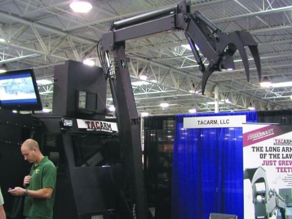 TacArm's Juggernaut is a rugged, multipurpose, tracked armored vehicle developed by a Washington state SWAT operator. It resembles a tracked backhoe. The Juggernaut's key feature is its telescoping hydraulic arm with a 24-foot reach. Using various attachments on this arm, operators can breach barricaded or fortified doors, windows, roofs and attics; rip new openings in solid walls; and insert chemical agents or communication equipment such as throw phones. Fully armored, the Juggernaut can be used to evacuate hostages and deploy operators. It can carry six operators inside its armored box and five more on a rear platform. The Juggernaut is operated via joystick.