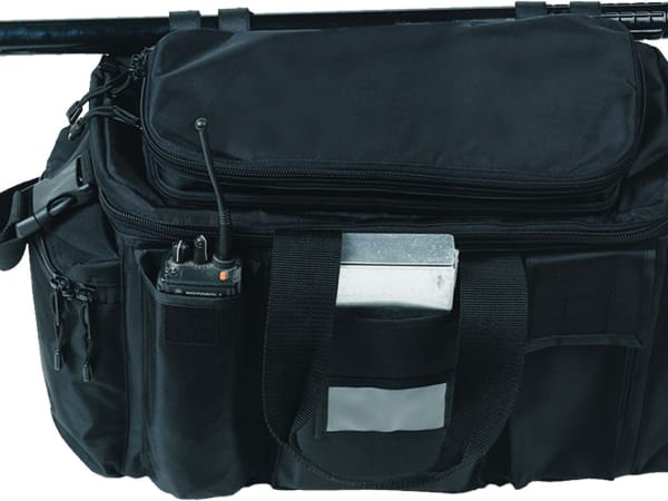 Strong Leather's model 90700 deluxe gear bag features a removable pocket on the top to hold items that officers need on a daily basis as well as four zip-closure pockets that Velcro to the inside of the bag to hold smaller items.
