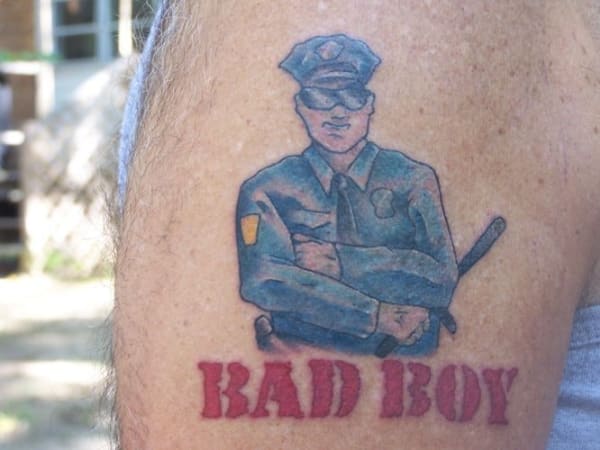 This officer's "Bad Boy" tattoo references Inner Circle's "Cops" theme song.