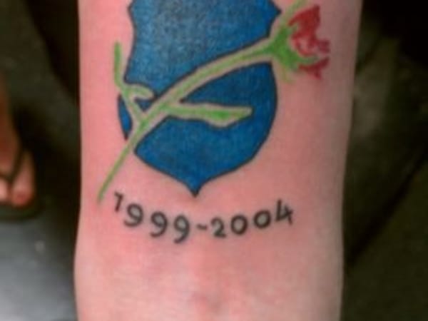 The "blue shield and rose" logo evokes a rose on a casket. The logo is used by the National Law Enforcement Officers Memorial Fund to honor fallen officers. This officer's tattoo also depicts the thin blue line of law enforcement.