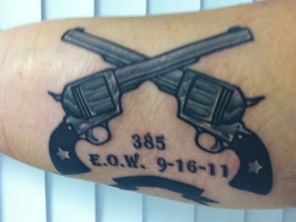 This officer's tattoo pays tribute to a fallen sergeant with two pistols, the date of the incident, and the sergeant's call sign (385).