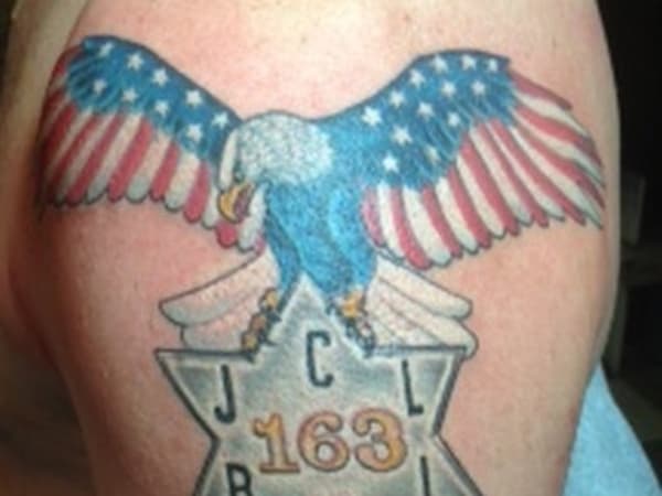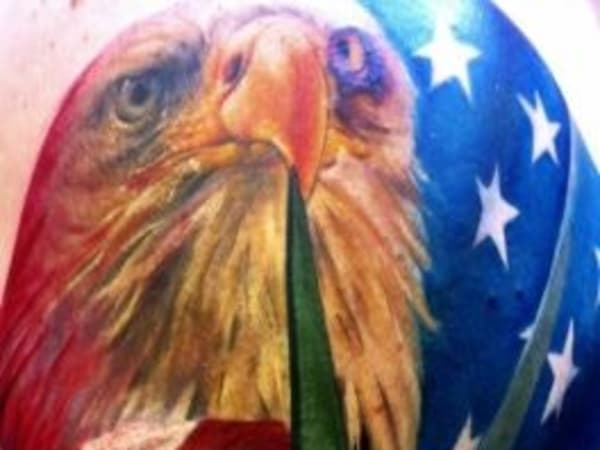 This officer's patriotic tattoo depicts the national symbols of the Statue of Liberty, American flag, and eagle with the Greek word for liberty.