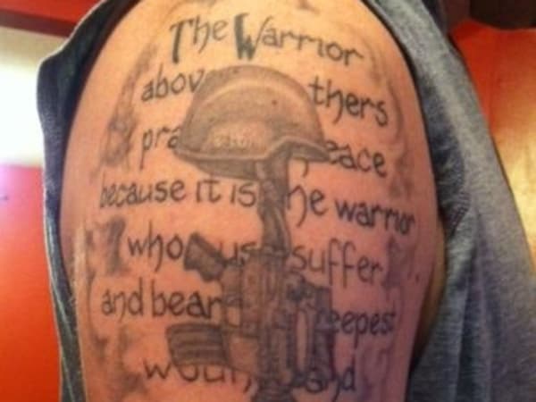 This Saint Michael tattoo also depicts the Gaelic phrase meaning "I'm my father's son." His father was an officer for 28 years.