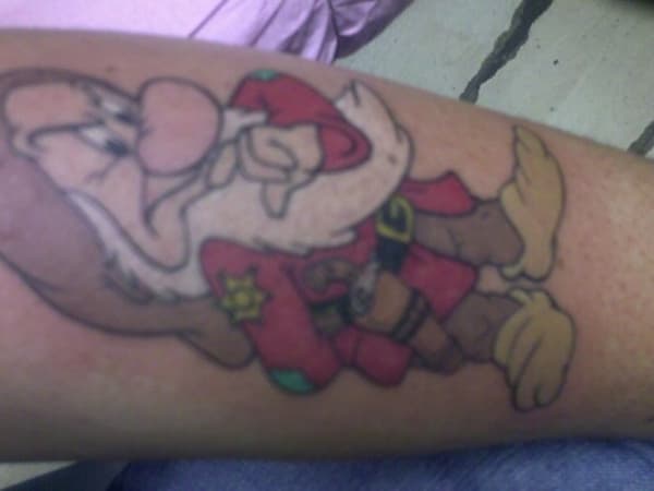 This tattoo depicts the officer's personality with Grumpy from Snow White and the Seven Dwarfs carrying a six shooter and tin star.