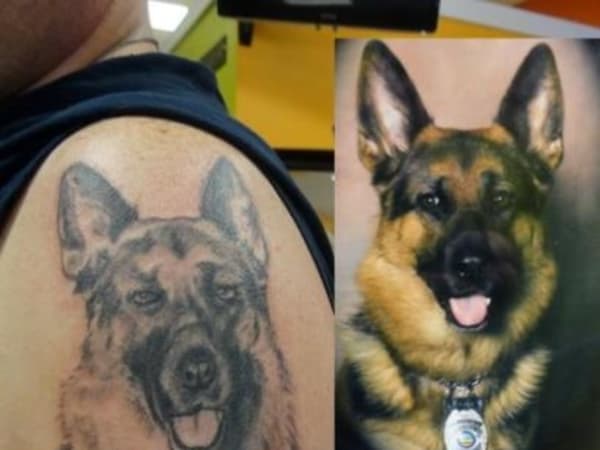 This officer's tattoo depicts his fallen K-9 partner, who died in a training accident.