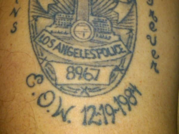 This officer's tattoo honors his fallen twin brother Duane "Duey" Johnson, an LAPD officer who was killed in a 1984 gunfight in Chinatown.