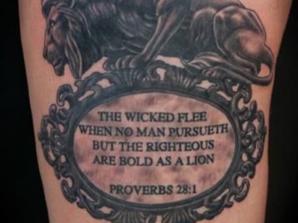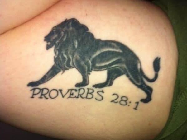 This memorial tattoo references Proverbs 28:1, "The wicked flee when no man pursueth, but the righteous are bold as a lion."